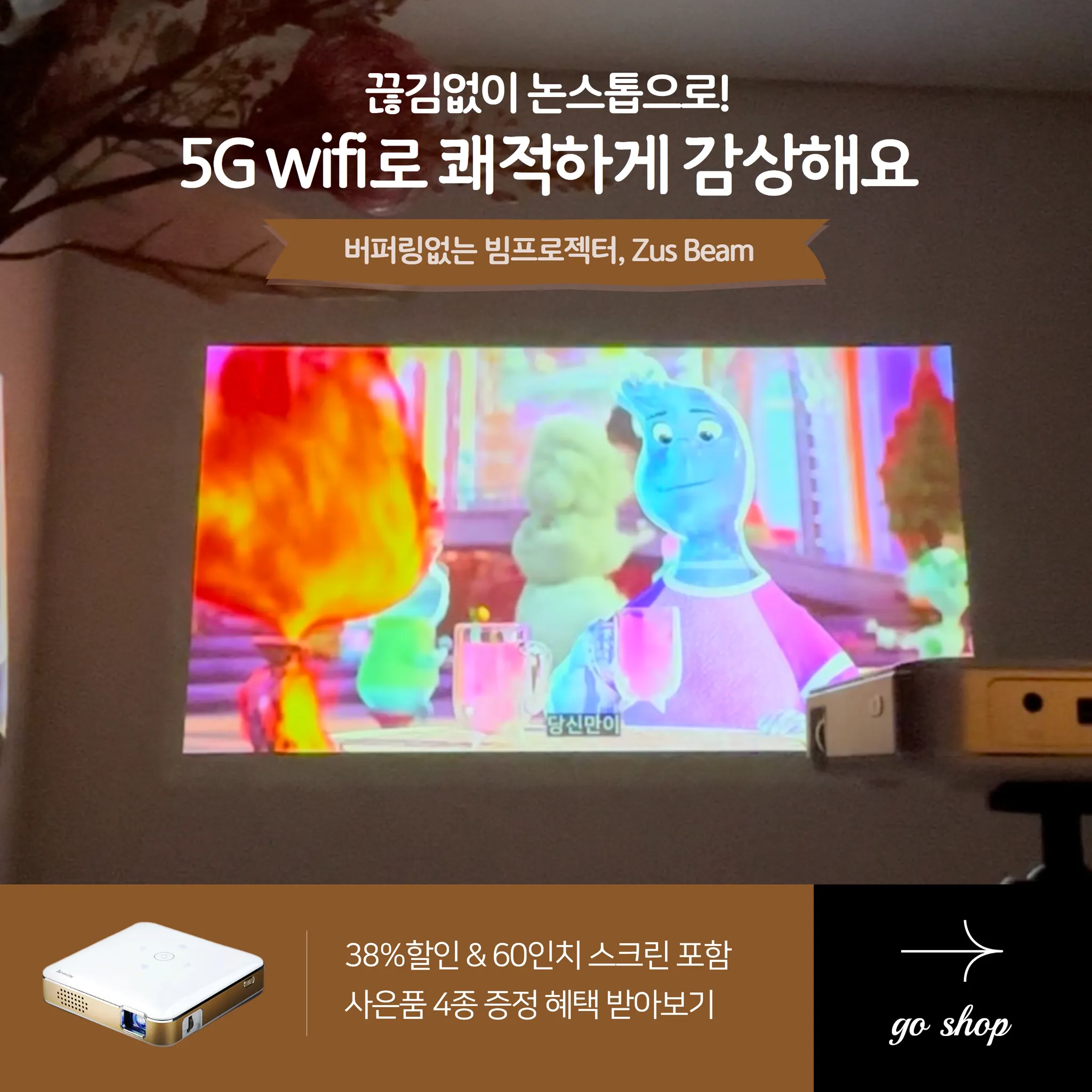 저스미니빔은 오직 제품력으로 네이버 판매 순위 1위를 달성한 미니빔 프로젝터를 판매하는 브랜드입니다.
