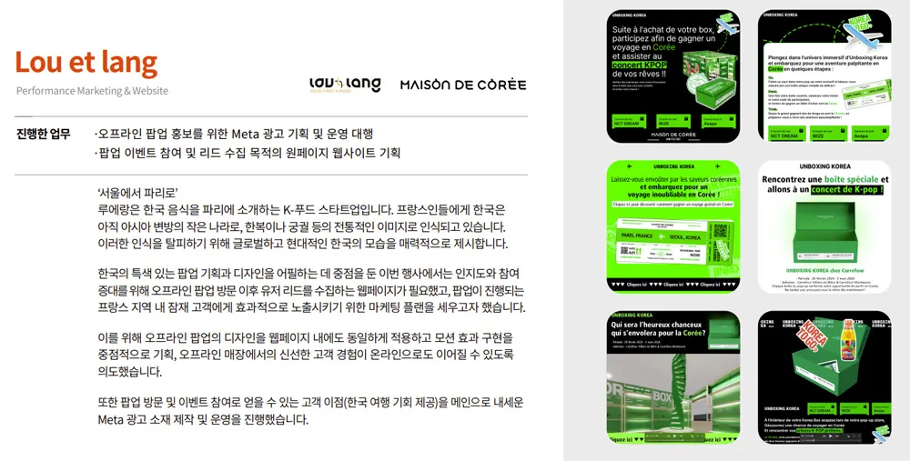 “언박싱 코리아 프로젝트였는데요. 박스를 열면 비행기 티켓 같은 게 있고, 티켓 넘버로 추첨해서 파리에서 서울로 여행을 보내주기도 했습니다. 박스 안엔 한국의 K푸드들이 들어가 있고요. 상세 페이지와 웹디자인, 팝업 스토어가 열리기 전 파리 주변 몇 킬로미터 내외해서 사전 홍보 마케팅을 했었습니다. 까르푸 임직원분들에겐 개개인 성함에 맞춰 개인화된 메시지를 보냈습니다.”